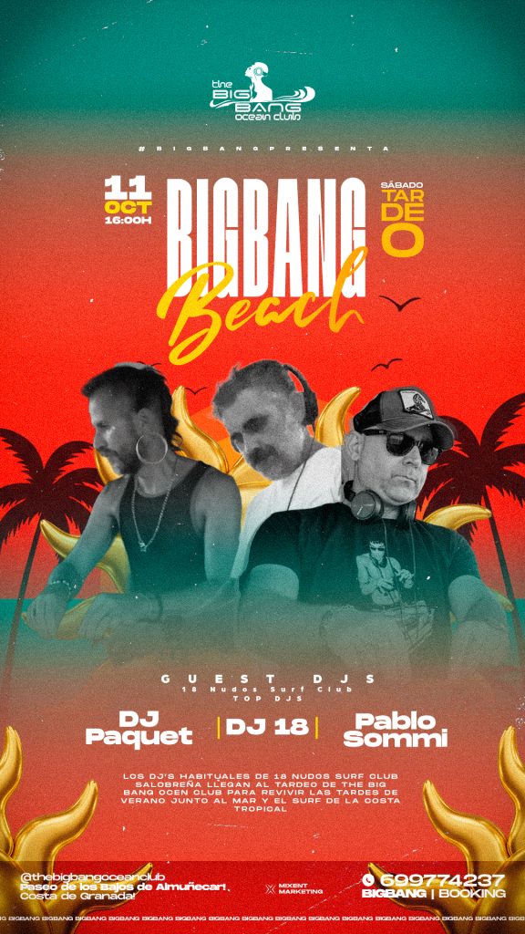 El sábado 11 de octubre desde las 16:00h, vuelve el tardeo más vibrante de la Costa Tropical. The Big Bang Ocean Club presenta una jornada musical frente al mar, ideal para quienes visitan Almuñécar el fin de semana y buscan un plan diferente, lleno de ritmo y sabor.